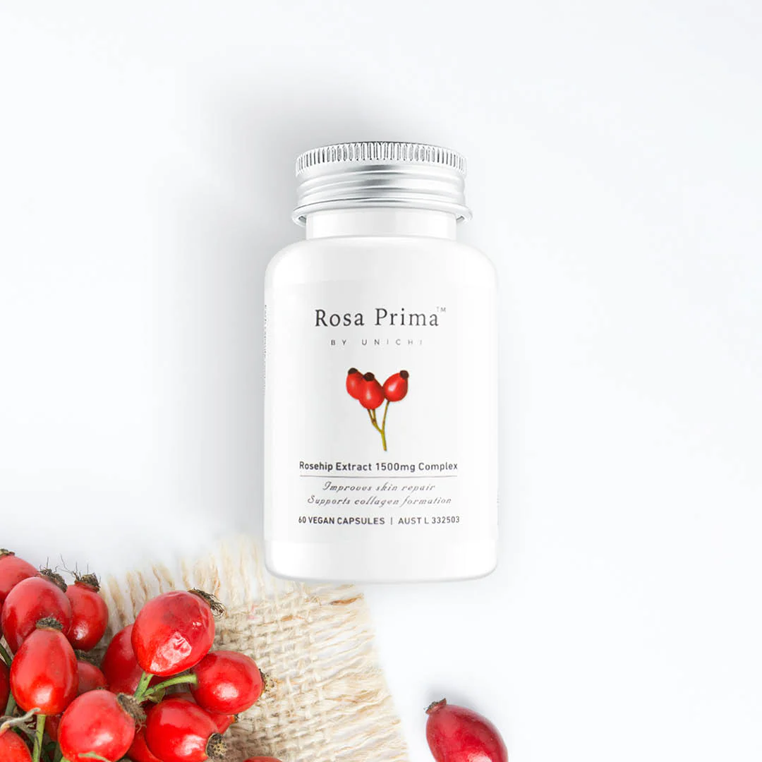 Rosa Prima`s Rosehip Extract 1500mg Complex naturally contains a variety of vitamins, including vitamin C & E. Our high strength rosehip extract helps support collagen formation and promote skin repair through the rosehip`s naturally high concentration of vitamin C.